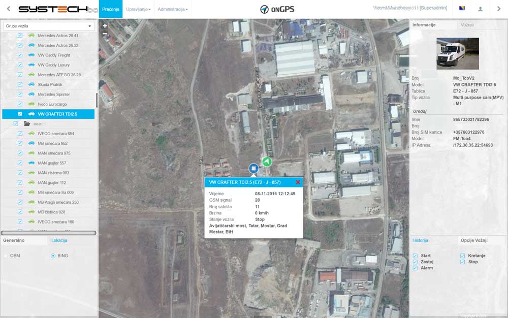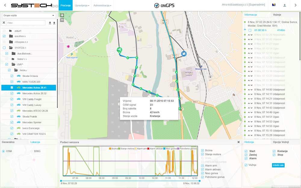 The user has access to the web application which is used to present data visualization and statistical graphics.The data is shown in an intuitive and easily understandable manner and, by using it, the user has a detailed overview of the state, movement and the current positions of his vehicles. The onGPS application also offers multifunctional possibilities and advanced tools such as: reviewing the vehicle rides history with detailed data in certain points of interest; reviewing vehicle maintenance service history and predicting the approximate date when the next vehicle maintenance service will be needed; simply and efficiently issuing work orders to drivers; viewing and analysing all the statistics, and other actions neccessary for efficient vehicle fleet supervision and management.